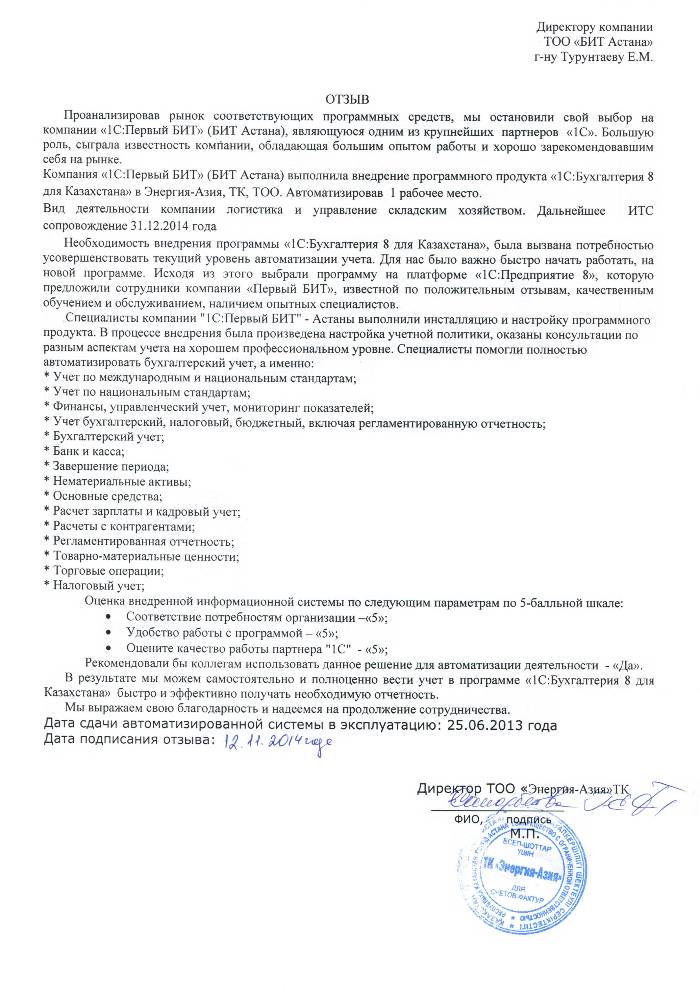 Внедренное решение: Автоматизация бухгалтерского учета в ТОО ТК "Энергия-Азия" на базе программного продукта "1С:Предприятие 8. Комплексная поставка для Казахстана"