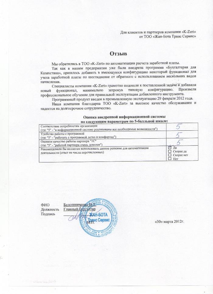 Внедренное решение: Автоматизация учёта заработной платы в ТОО «Жан-Бота Транс Сервис» на базе ПП "1С:Бухгалтерия 8 для Казахстана"