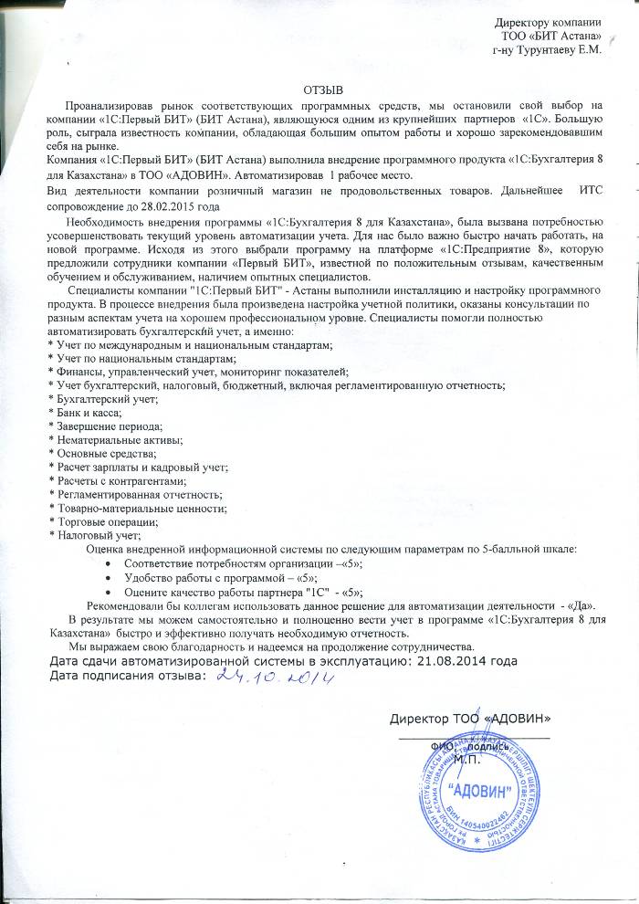 Внедренное решение: Автоматизация бухгалтерского учета на базе программного продукта "1С:Бухгалтерия 8 для Казахстана" в ТОО "АДОВИН"