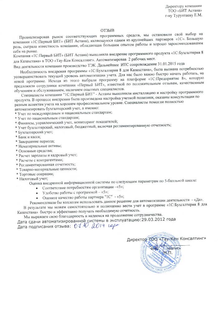 Внедренное решение: Автоматизация бухгалтерского учета в ТОО "Тау-Кен Консалтинг" на базе программного продукта "1С:Бухгалтерия 8 для Казахстана"