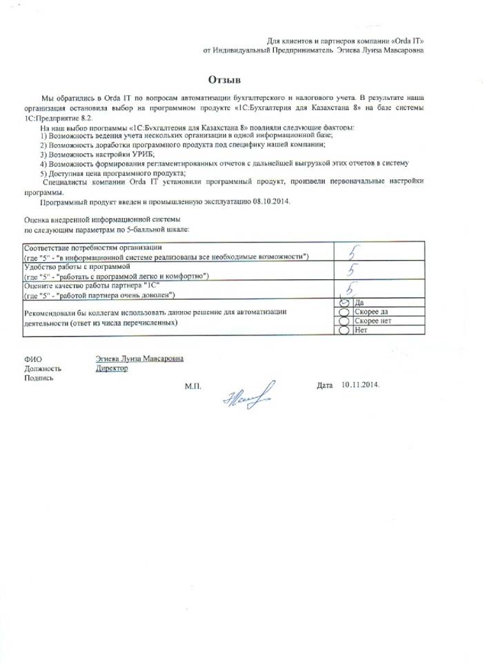 Внедренное решение: ИП Эгиева Луиза Мавсаровна автоматизировал бухгалтерский и налоговый учёт на базе ПП "1С:Предприятие 8 Бухгалтерия для Казахстана"