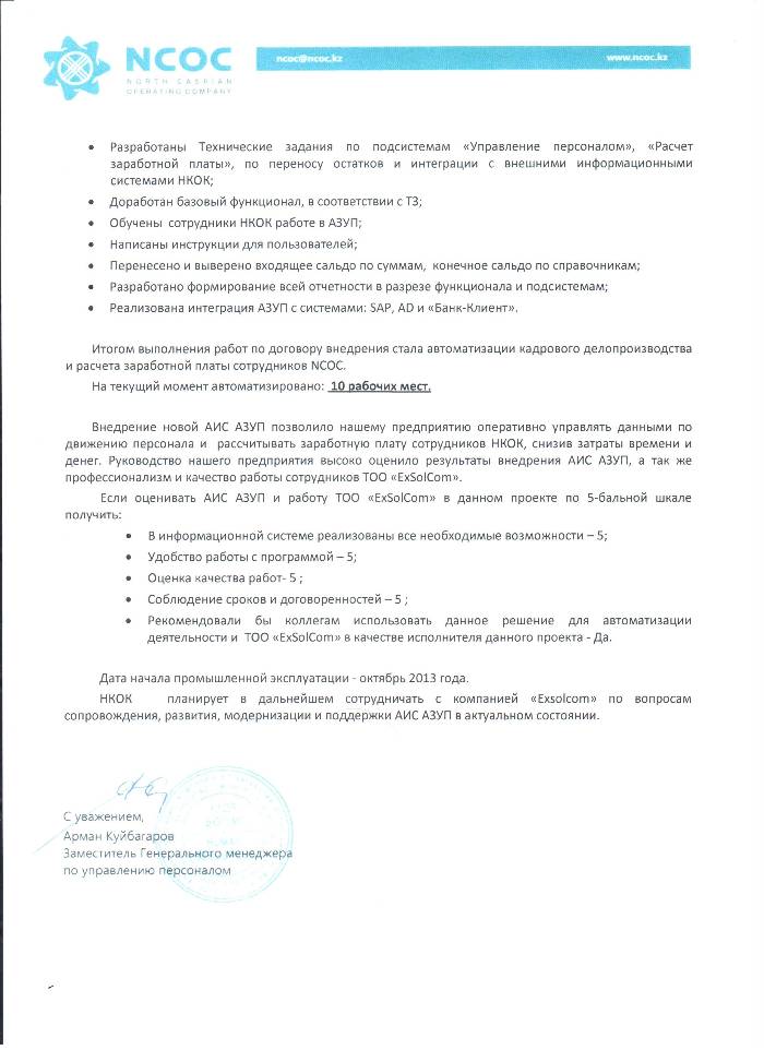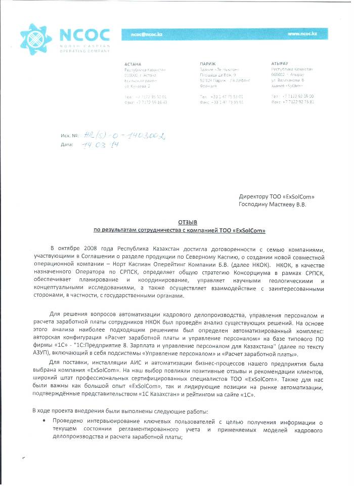 Внедренное решение: Автоматизация бизнес-процессов на базе программного продукта «1С:Предприятие 8. Зарплата и Управление Персоналом для Казахстана» в филиале компании "Норт Каспиан Оперейтинг Компани"