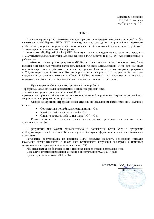 Внедренное решение: Автоматизация бухгалтерского учета в ТОО "ВостокТранс LTD" на базе программного продукта "1С:Предприятие 8. Бухгалтерия для Казахстана.Базовая версия"