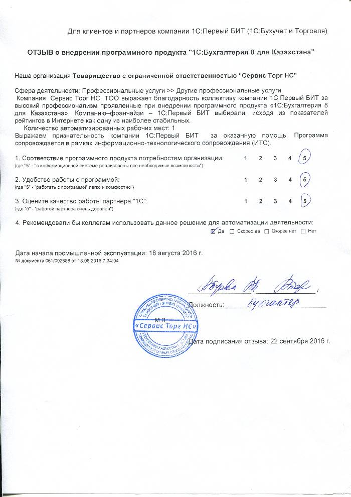 Внедренное решение: Автоматизация бухгалтерского учета на базе программного продукта "1С:Бухгалтерия 8 для Казахстана" в ТОО "Сервис Торг НС"
