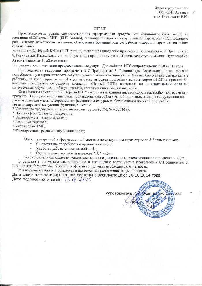 Внедренное решение: Автоматизация розничного учета на базе программного продукта "1С:Предприятие 8. Розница для Казахстана" у индивидуального предпринимателя "Творческой студии Жанны Чулановой"