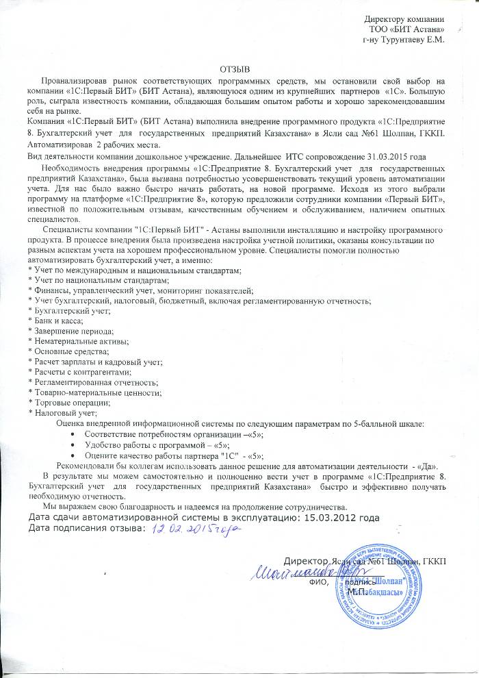 Внедренное решение: Автоматизация бухгалтерского учета в ГККП "Ясли сад №61 "Шолпан" на базе программного продукта "1С:Предприятие 8. Бухгалтерский учет для государственных предприятий Казахстана" (2 рабочих места)