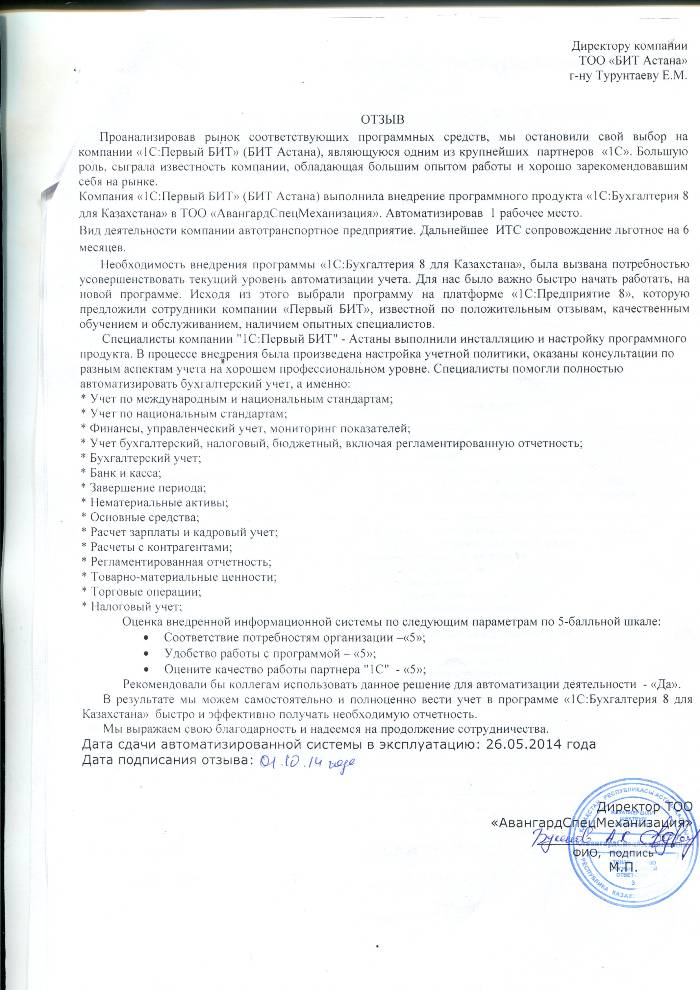 Внедренное решение: Автоматизация бухгалтерского учета в ТОО "АвангардСпецМеханизация" на базе программного продукта "1С:Бухгалтерия 8 для Казахстана"