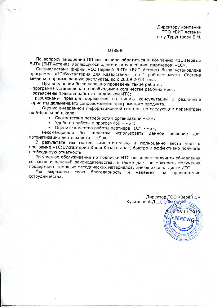 Внедренное решение: Автоматизация бухгалтерского учета в ТОО "Зере НС" на базе программного продукта "1С:Предприятие 8. Бухгалтерия для Казахстана"