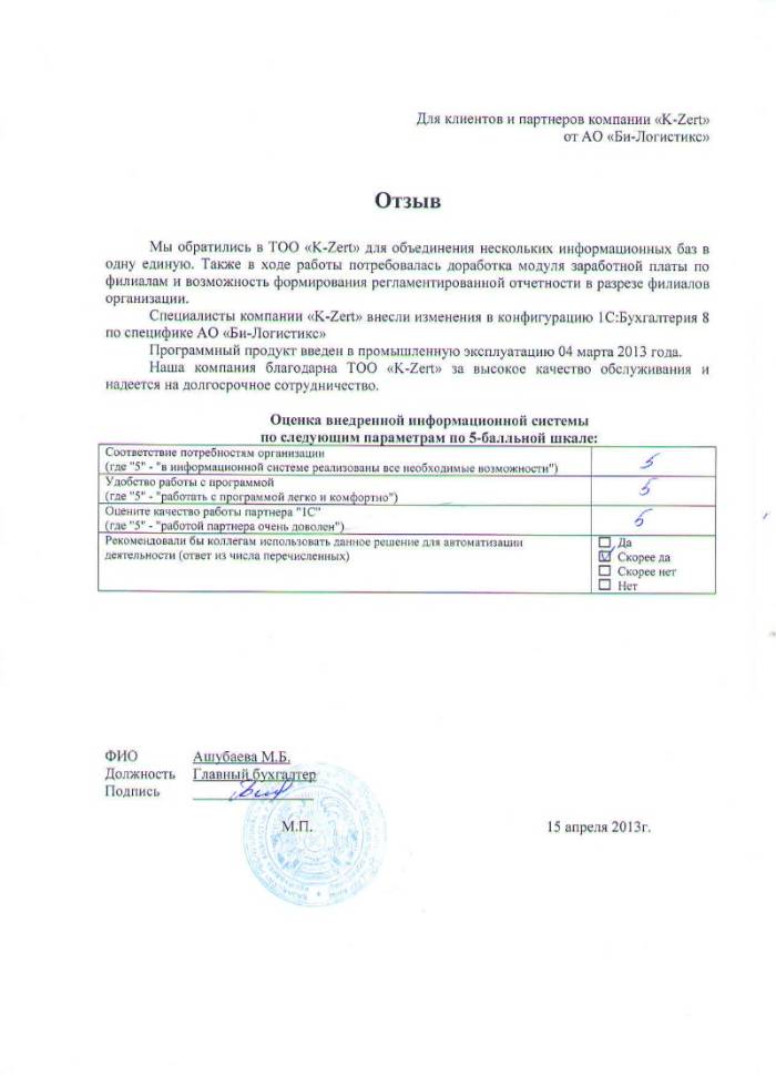 Внедренное решение: АО "Би-Логистикс" автоматизировал учет заработной платы по филиалам и формы налоговой отчетности на базе ПП "1С:Бухгалтерия 8 для Казахстана"
