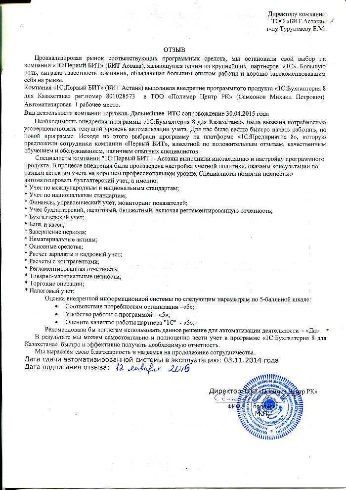 Внедренное решение: Автоматизация бухгалтерского учета в ТОО "Полимер Центр РК" (Самсонов Михаил Петрович) на базе программного продукта "1С:Бухгалтерия 8 для Казахстана" 2 программный продукт