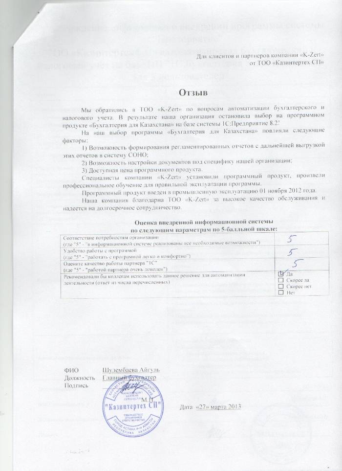 Внедренное решение: ТОО «Казинтертех СП» автоматизировал бухгалтерский и налоговый учёт на базе ПП "1С:Бухгалтерия 8 для Казахстана для 5 пользователей"