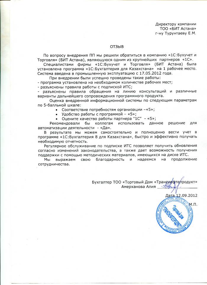 Внедренное решение: Автоматизация бухгалтерского учета в ТОО "Торговый дом "Транснефтепродукт" на базе программного продукта "1С:Бухгалтерия 8 для Казахстана"