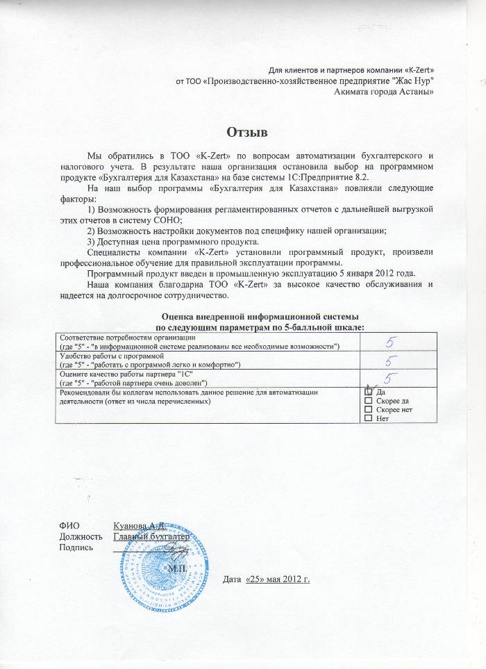 Внедренное решение: Автоматизация бухгалтерского и налогового учёта в Производственно-хозяйственном предприятии "Жас Нур" Акимата города Астаны на базе ПП "1С:Бухгалтерия 8 для Казахстана"