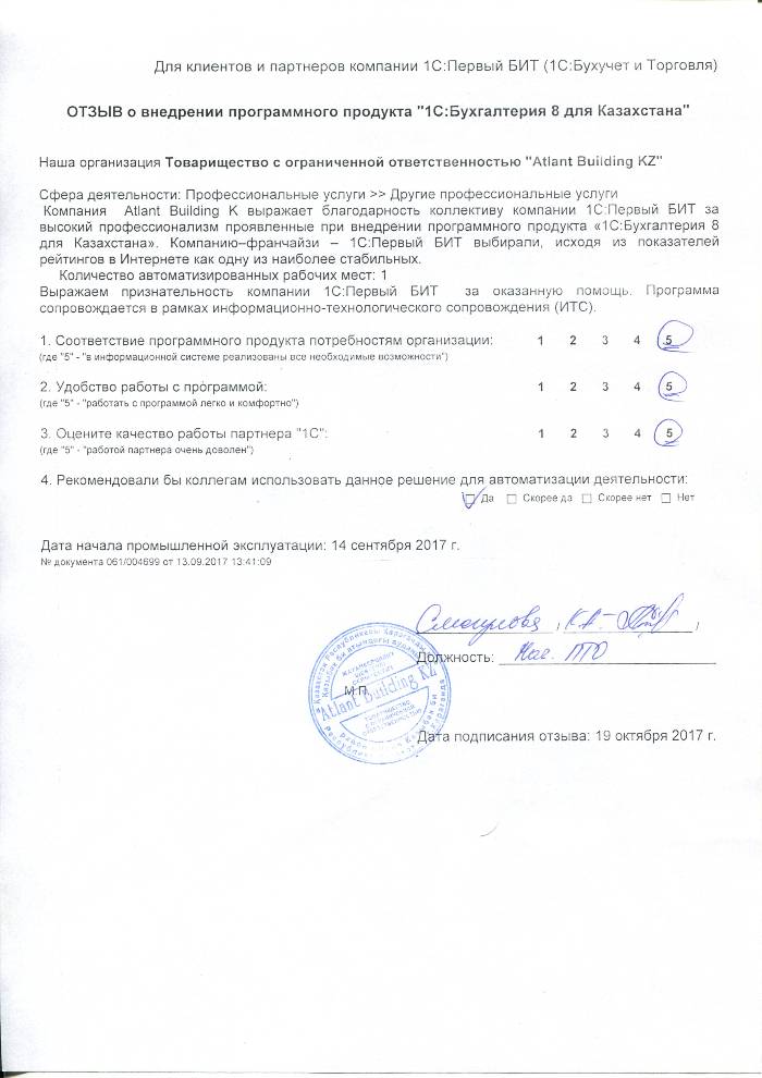 Внедренное решение: Автоматизация бухгалтерского учета на базе программного продукта"1С:Бухгалтерия 8 для Казахстана" в ТОО "Atlant Building KZ"
