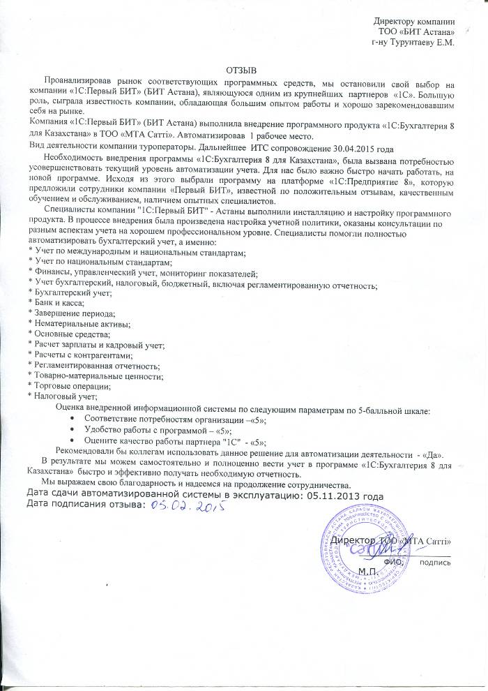 Внедренное решение: Автоматизация бухгалтерского учета в ТОО "МТА " Сатті" на базе программного продукта "1С:Предприятие 8. Бухгалтерия для Казахстана"