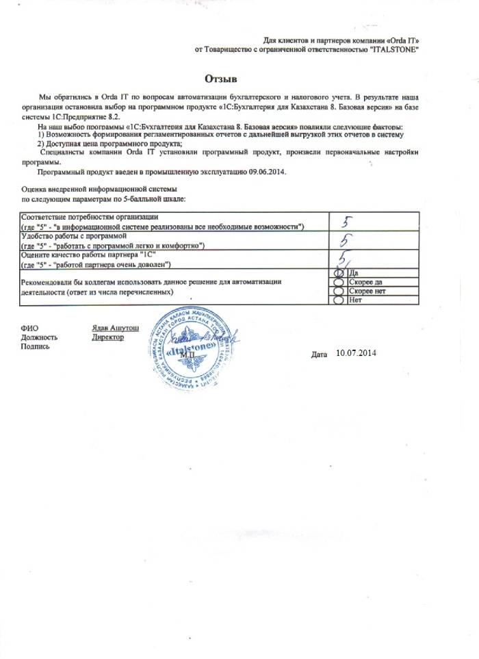 Внедренное решение: ТОО "ITALSTONE" автоматизировал бухгалтерский и налоговый учёт на базе ПП "1С:Бухгалтерия 8 для Казахстана. Базовая версия"