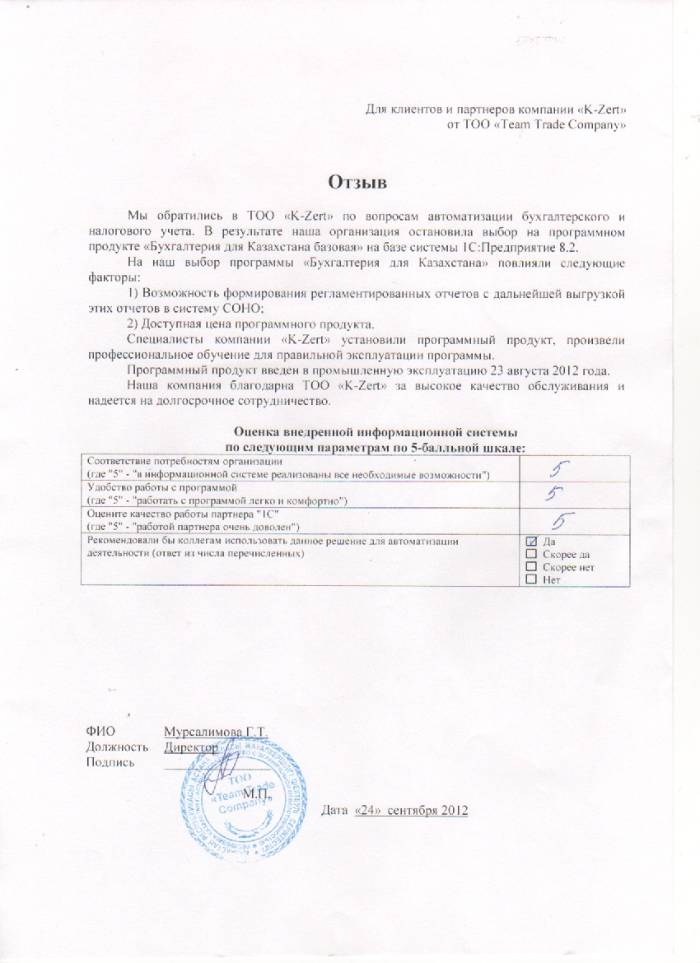 Внедренное решение: Автоматизация бухгалтерского и налогового учёта в ТОО "Team Trade Company" на базе ПП "1С:Бухгалтерия 8 для Казахстана"