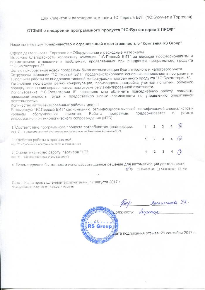 Оценка качества работы партнера "1С": 5