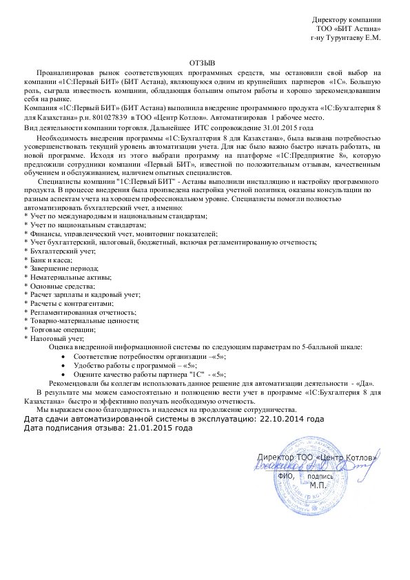 Внедренное решение: Автоматизация бухгалтерского учета в ТОО "Центр Котлов" на базе программного продукта "1С:Бухгалтерия 8 для Казахстана"