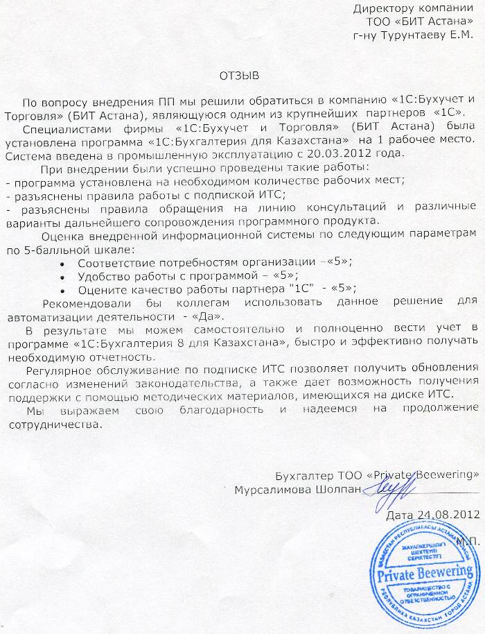 Внедренное решение: Автоматизация бухгалтерского учета в ТОО "Private Beewering" на базе программного продукта "1С:Бухгалтерия 8 для Казахстана"