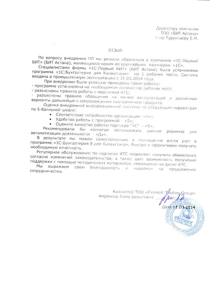 Внедренное решение: Автоматизация бухгалтерского учета в ТОО "ELEMENT TRADING GROUP" на базе программного продукта "1С:Предприятие 8. Бухгалтерия для Казахстана"