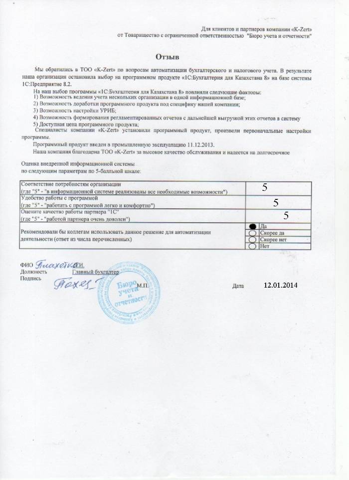 Внедренное решение: В ТОО «Бюро учета и отчетности» автоматизирован бухгалтерский и налоговый учёт на базе ПП "1С:Бухгалтерия 8 для Казахстана"