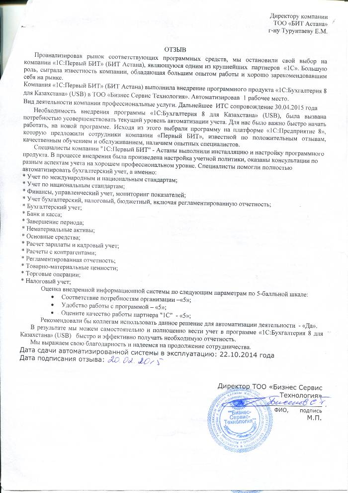 Внедренное решение: Автоматизация бухгалтерского учета в ТОО "Бизнес Сервис Технология" на базе программного продукта "1С:Бухгалтерия 8 для Казахстана" (USB)