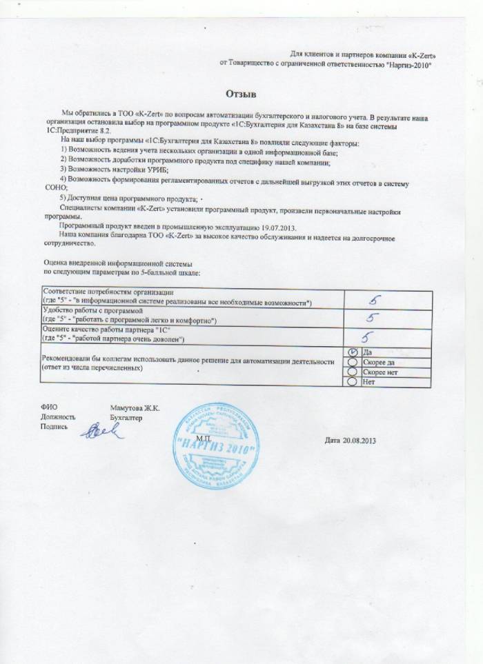Внедренное решение: ТОО "Наргиз-2010" автоматизировала бухгалтерский и налоговый учет на базе ПП "1С:Бухгалтерия 8 для Казахстана"