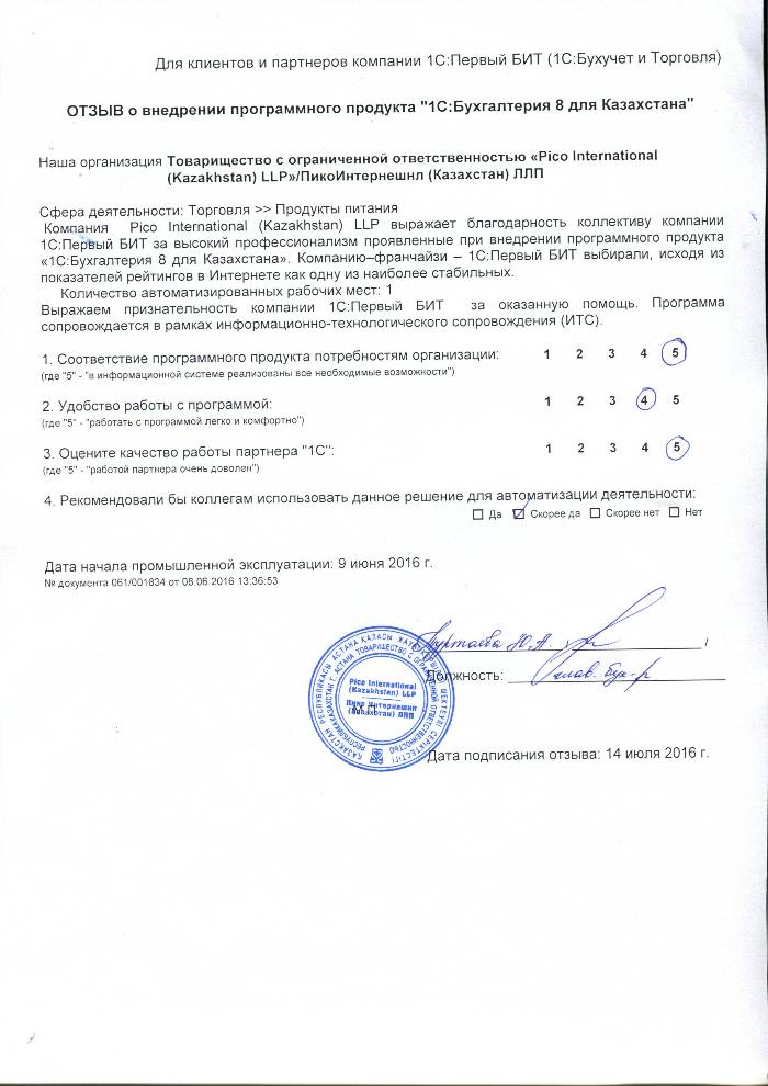 Внедренное решение: Автоматизация бухгалтерского учета на базе программного продукта "1С:Бухгалтерия 8 для Казахстана" в ТОО «Pico International (Kazakhstan) LLP»