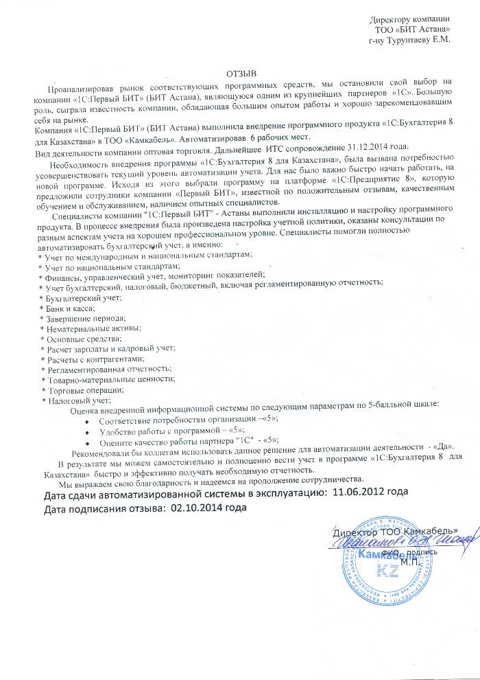Внедренное решение: Автоматизация бухгалтерского учета в ТОО "Камкабель" на базе программного продукта "1С:Бухгалтерия 8 для Казахстана"