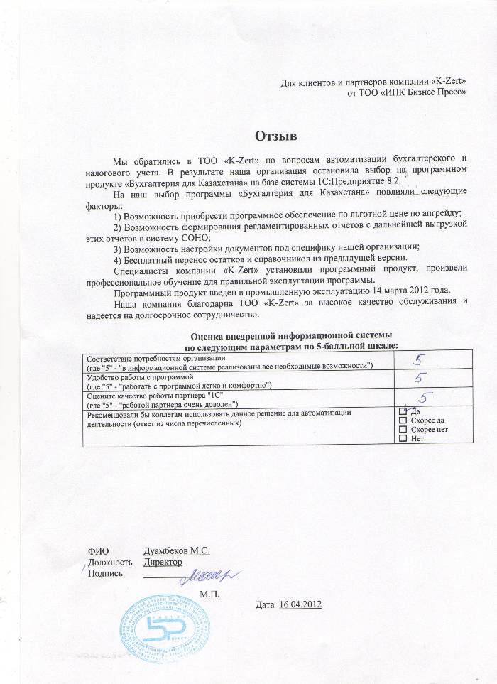 Внедренное решение: Автоматизация бухгалтерского и налогового учёта в ТОО «ИПК Бизнес Пресс» на базе ПП "1С:Бухгалтерия 8 для Казахстана"