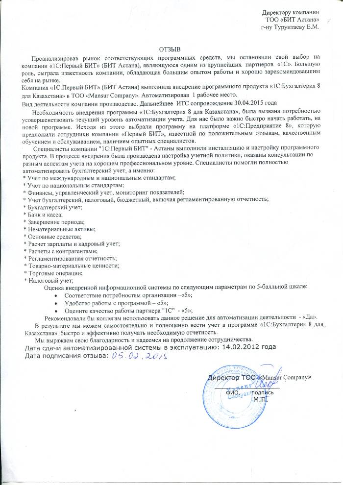 Внедренное решение: Автоматизация бухгалтерского учета в ТОО "Mansur Company" на базе программного продукта "1С:Бухгалтерия 8 для Казахстана"