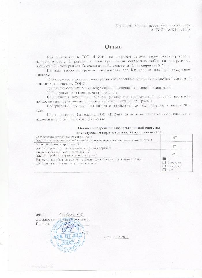 Внедренное решение: Автоматизация бухгалтерского и налогового учёта в ТОО «АСК НТ ЛТД» на базе ПП "1С:Бухгалтерия 8 для Казахстана"