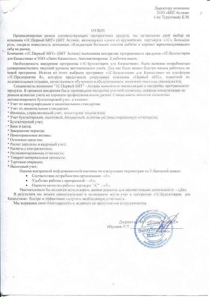 Внедренное решение: Автоматизация бухгалтерского учета у индивидуального предпринимателя "StroySnabKZ" на базе программного продукта "1С:Бухгалтерия 8 для Казахстана"