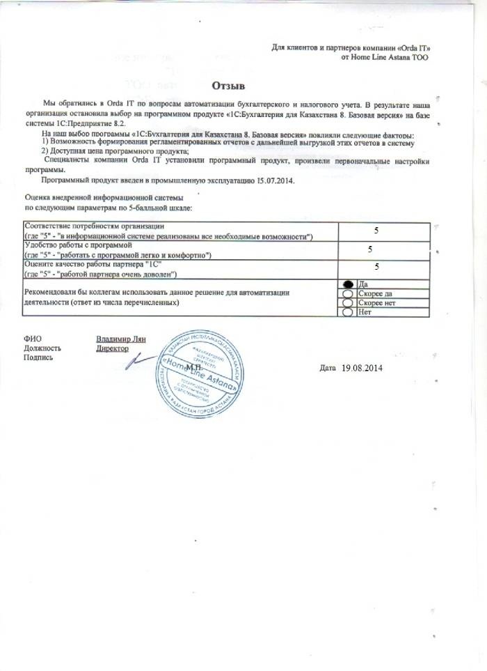 Внедренное решение: ТОО «Home Line Astana» автоматизировал оперативные задачи и управленческий учёт на базе ПП "1С:Предприятие 8. Управление торговлей для Казахстана"