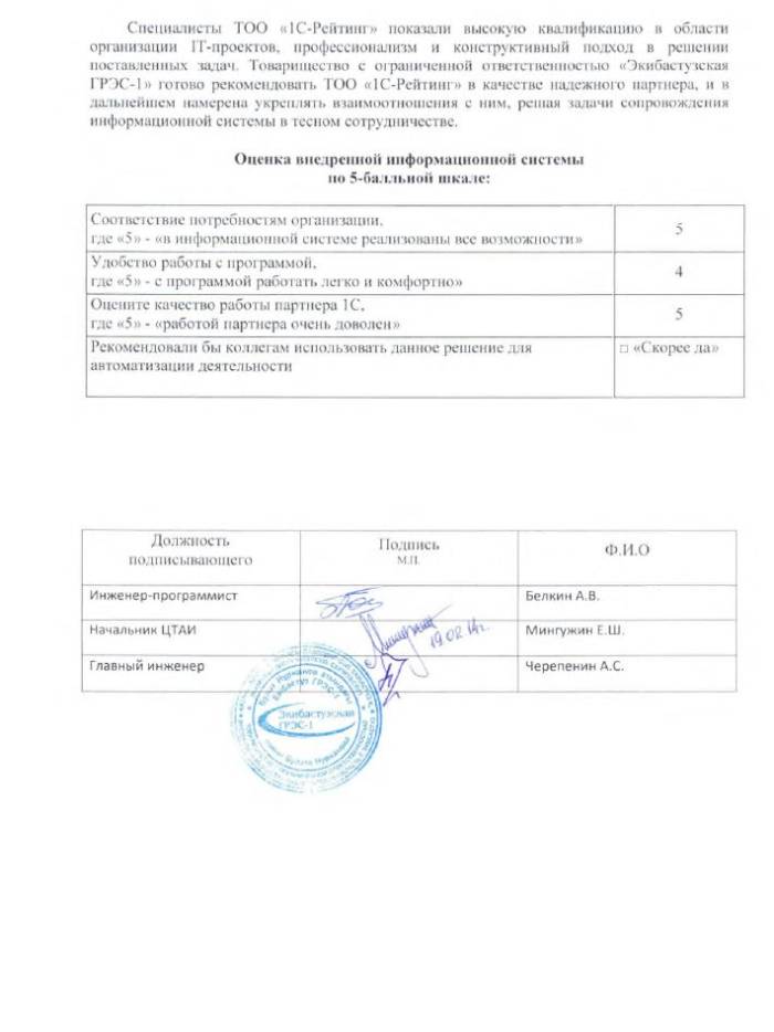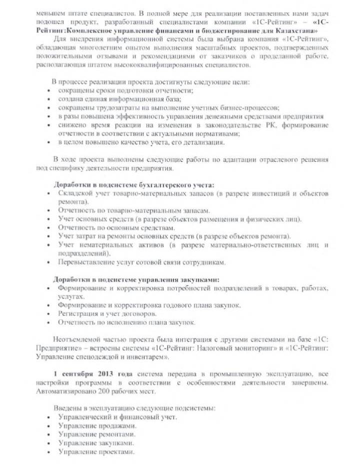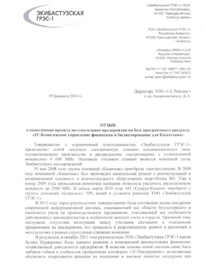 Внедренное решение: Комплексная автоматизация финансово-хозяйственной деятельности в ТОО «Экибастузская ГРЭС-1» при помощи отраслевого решения «1С-Рейтинг:Комплексное управление финансами и бюджетирование для Казахстана»