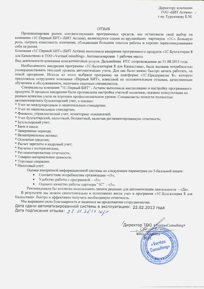 Внедренное решение: Автоматизация бухгалтерского учета в ТОО "VeritasConsulting" на базе программного продукта "1С:Предприятие 8.Бухгалтерия для Казахстана"