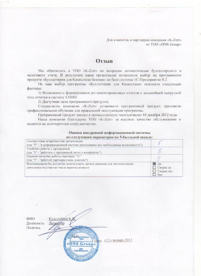 Внедренное решение: ТОО "DNS Group" автоматизировал бухгалтерский и налоговый учёт на базе ПП "1С:Бухгалтерия 8 для Казахстана. Базовая версия"