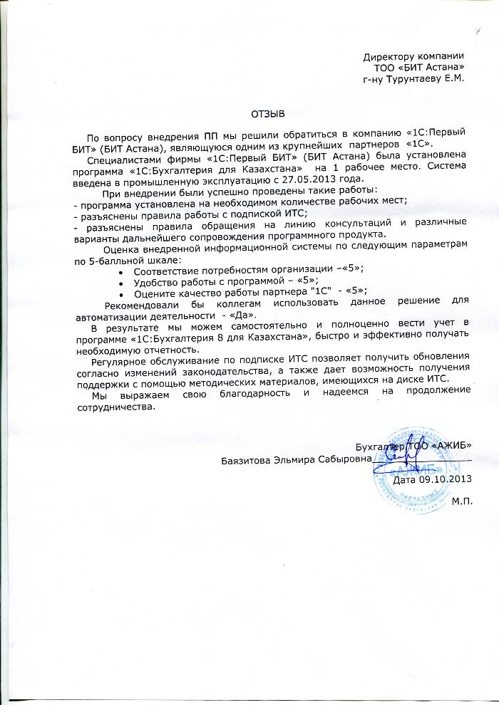 Внедренное решение: Автоматизация бухгалтерского учета в ТОО "АЖИБ" на базе программного продукта "1С:Предприятие 8.Бухгалтерия для Казахстана"