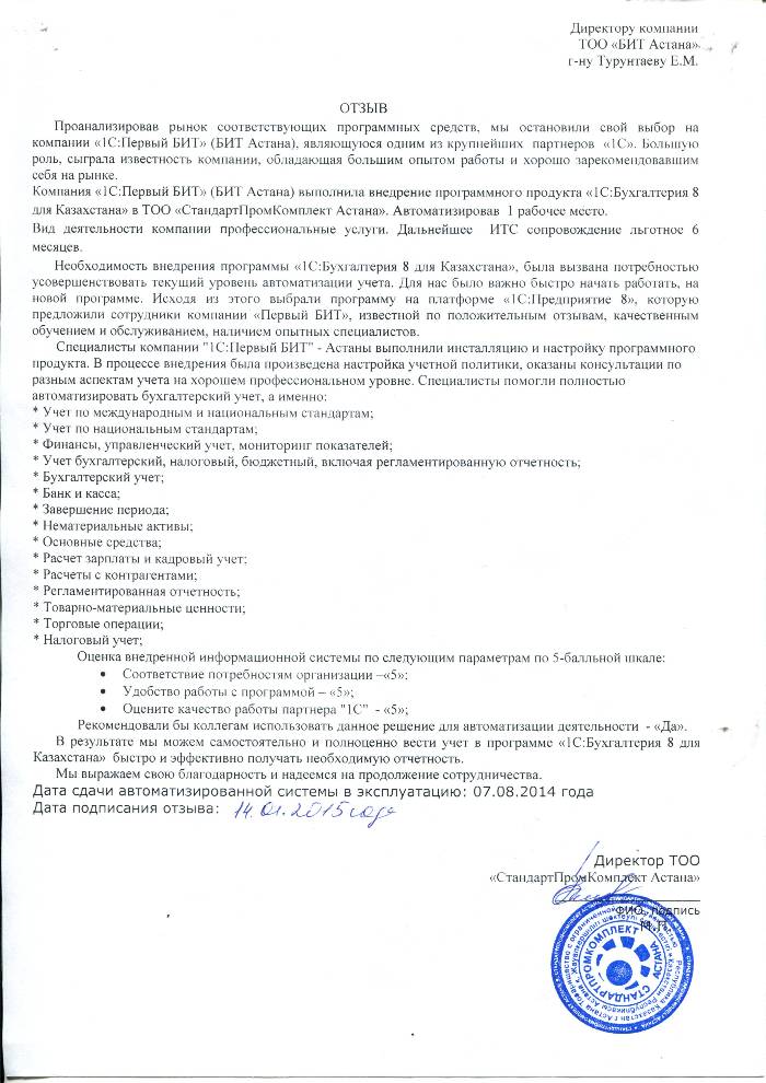 Внедренное решение: Автоматизация программного продукта в ТОО "СтандартПромКомплект Астана" на базе программного продукта "1С:Бухгалтерия 8 для Казахстана"