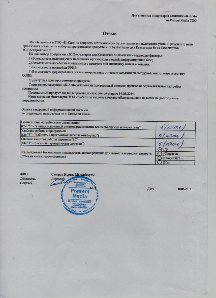 Внедренное решение: ТОО "Present Media" автоматизировал бухгалтерский и налоговый учёт на базе ПП "1С:Бухгалтерия 8 для Казахстана"