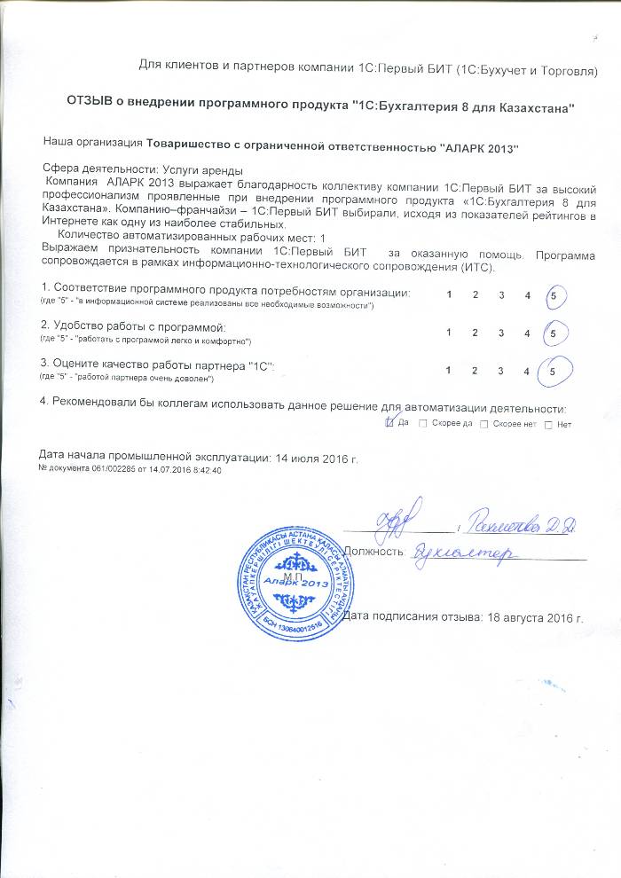Внедренное решение: Автоматизация бухгалтерского учета на базе программного продукта "1С:Бухгалтерия 8 для Казахстана" в ТОО "АЛАРК 2013"