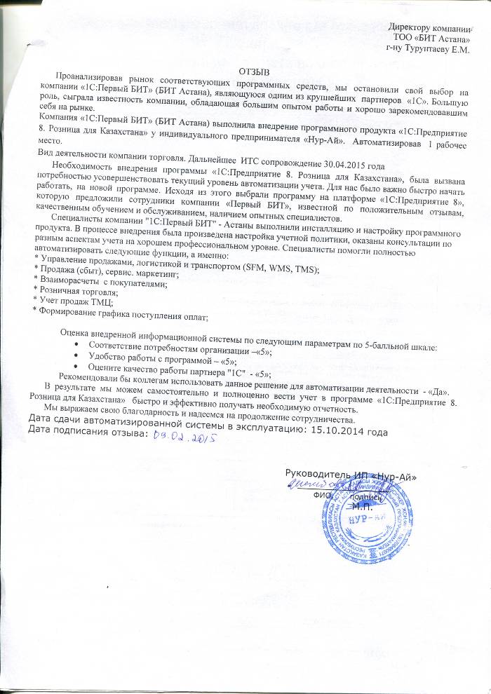 Отзыв клиента на внедренное решение