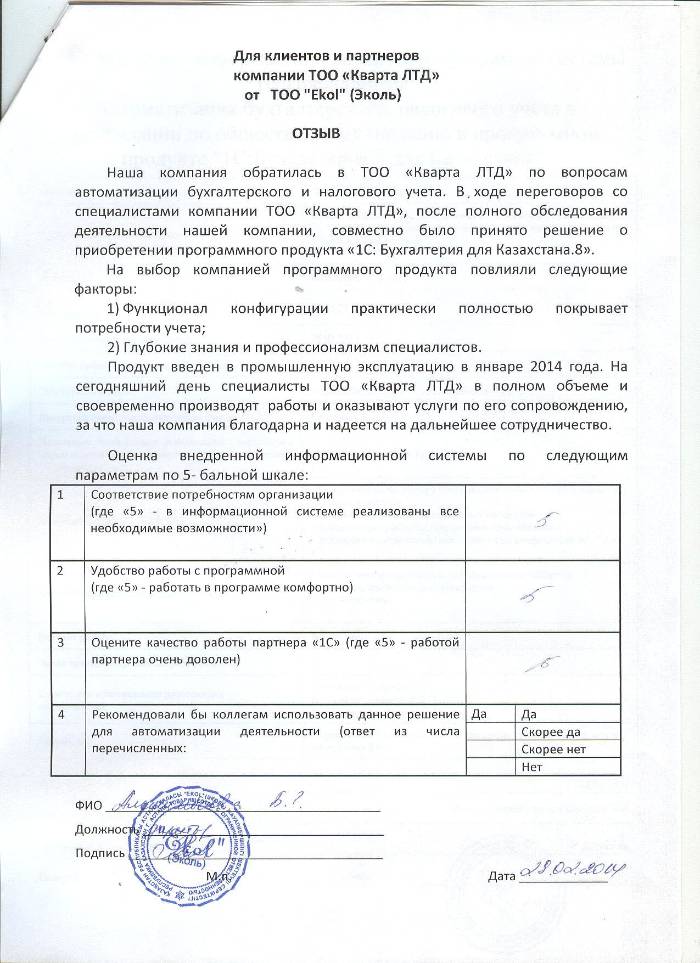 Внедренное решение: Автоматизация бухгалтерского, налогового учета в организации по общественному питанию в программном продукте "1С:Бухгалтерия 8 для Казахстана"