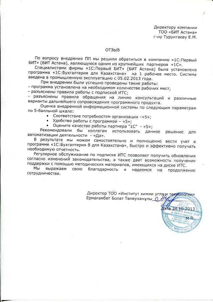 Внедренное решение: Автоматизация бухгалтерского учета в ТОО "Институт химии угля и технологии" на базе программного продукта "1С:Предприятие 8.Бухгалтерия для Казахстана"