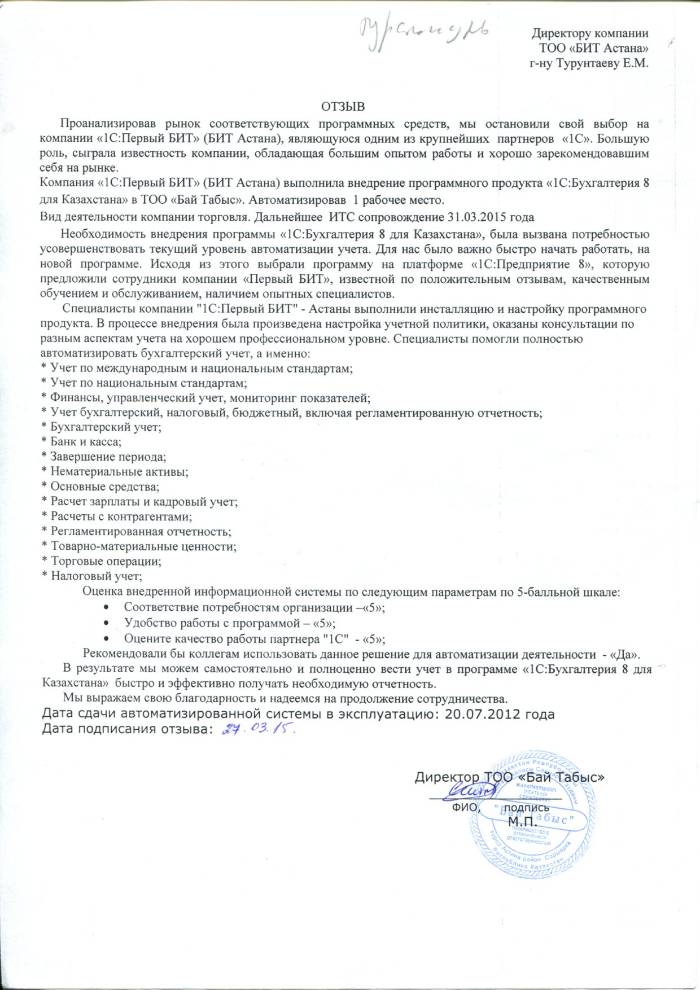 Внедренное решение: Автоматизация бухгалтерского учета в ТОО "Бай Табыс" на базе программного продукта "1С:Бухгалтерия 8 для Казахстана"