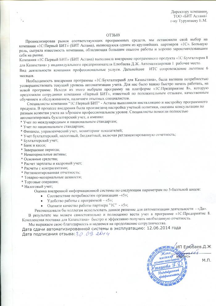 Внедренное решение: Автоматизация бухгалтерского учета у индивидуального предпринимателя Елюбаева Д.Ж на базе программного продукта "1С:Бухгалтерия 8 для Казахстана"