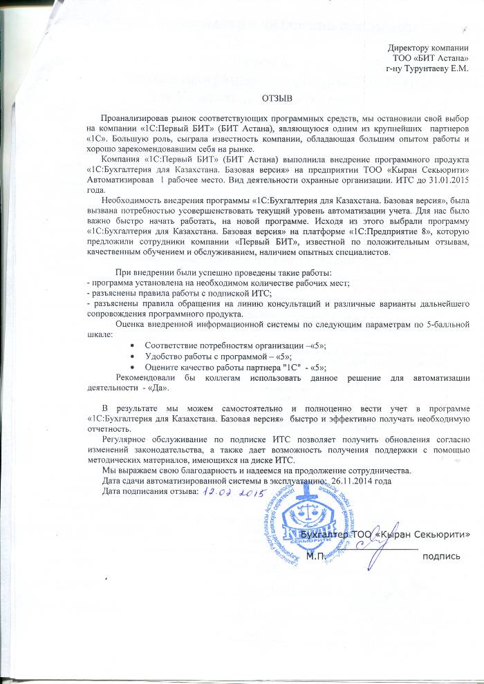 Внедренное решение: Автоматизация бухгалтерского учета в ТОО "Кыран Секьюрити" на базе программного продукта "1С:Бухгалтерия 8 для Казахстана. Базовая версия"