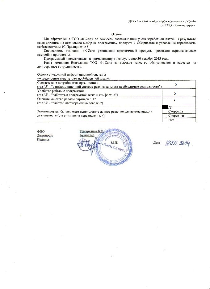 Внедренное решение: Внедрение ПП "1С:Зарплата и Управление Персоналом 8 для Казахстана" в ТОО "Хан Шатыры"