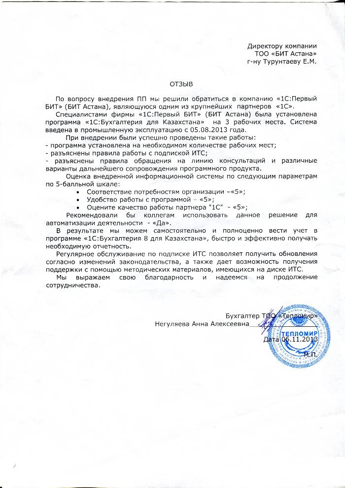 Внедренное решение: Автоматизация бухгалтерского учета в ТОО "Тепломир" на базе программного продукта "1С:Предприятие 8. Бухгалтерия для Казахстана"